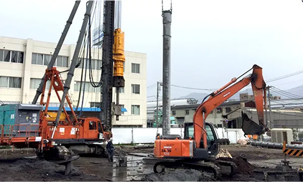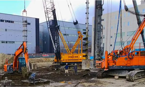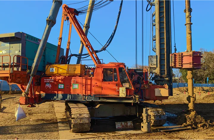 杭基礎工事は杭打ち機本体を中心に回りを整備するショベル、指揮をとる手元など